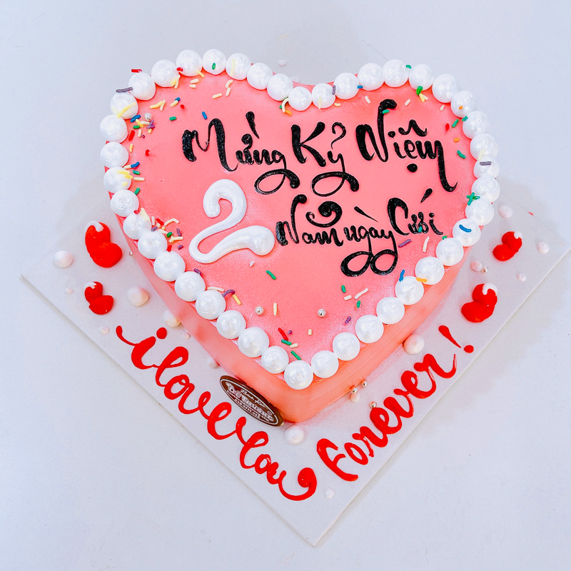 Những dòng chữ đơn giản, như tên hai người và số năm kỷ niệm, được trang trí tinh tế trên bánh, tạo nên sự ấm áp cho bữa tiệc. Với kích thước phù hợp cho 2 đến 10 người, bánh kem trở thành lựa chọn hoàn hảo cho các buổi họp mặt và kỷ niệm nhỏ. Đặc biệt, hương vị của bánh kem, từ các loại kem đa dạng cho đến những trang trí độc đáo chủ đề tình yêu, khiến cho mỗi miếng bánh đều mang lại sự hài lòng.