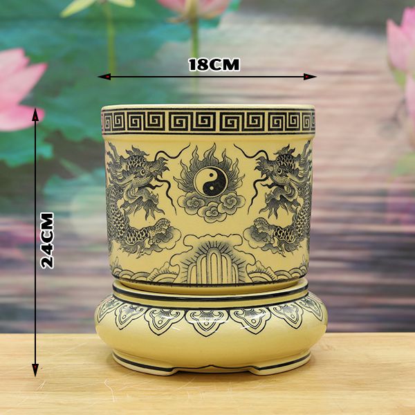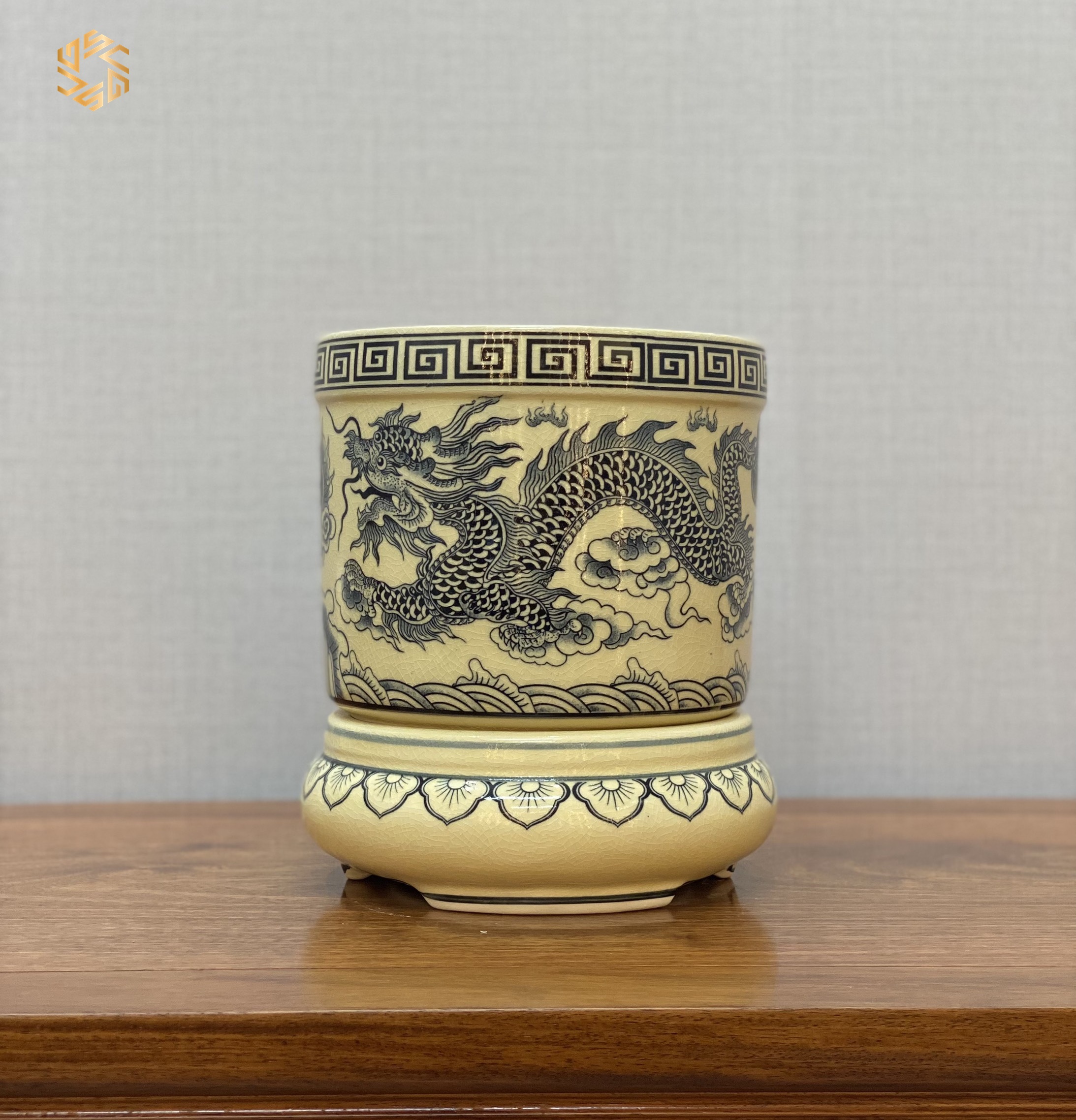 Mỗi chiếc bát hương đều được chế tác tinh xảo từ gốm truyền thống, với họa tiết rồng sống động và men rạn cổ. Đặc điểm này không chỉ làm tăng thêm vẻ đẹp cho sản phẩm mà còn chứa đựng ý nghĩa linh thiêng trong văn hóa thờ cúng. Khi chọn bát hương, người dùng có thể tham khảo kích thước phù hợp với bàn thờ, từ chiều cao đến đường kính.
