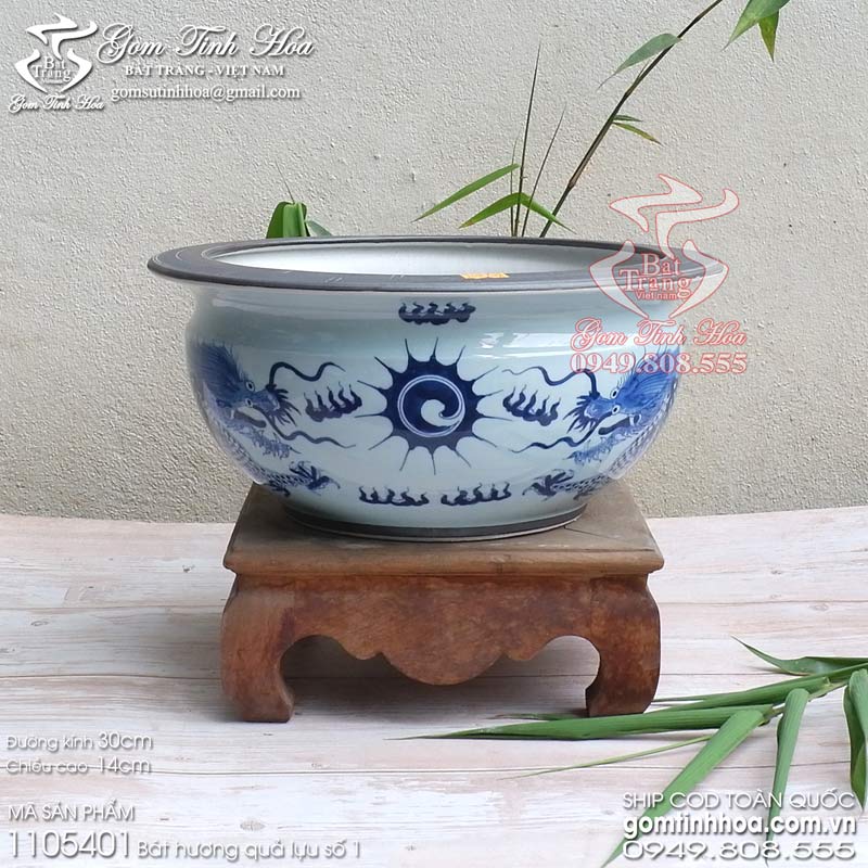 Với kiểu dáng quả lựu tròn đầy, bát hương không chỉ đẹp mắt mà còn thể hiện ý nghĩa của sự sinh sôi, phát triển. Không gian thờ cúng sẽ trở nên trang nghiêm và thanh tịnh hơn khi có sự hiện diện của bát hương men lam, nơi con cháu dâng hương, cầu nguyện và gửi gắm lòng thành kính đến tổ tiên.