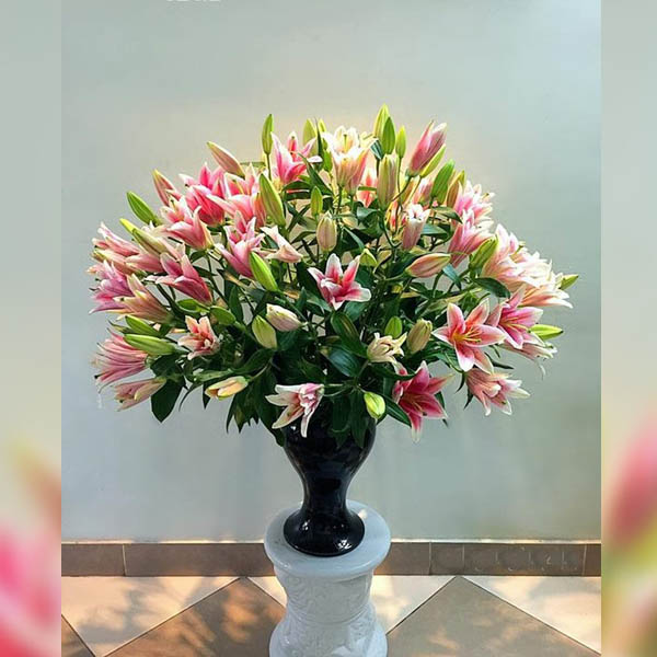 Khi cắm hoa ly, bạn hãy chọn một cành đẹp nhất để làm cành chính, cắt chéo gốc ở góc 45 độ và đặt vào giữa bình. Cắm thêm những cành hoa phụ xung quanh sẽ giúp tạo ra một bố cục hài hòa, làm nổi bật vẻ đẹp của từng bông hoa. Không chỉ dành cho bàn khách hay bàn làm việc, chiếc bình còn có thể đặt ở góc trang điểm để thêm phần sinh động.