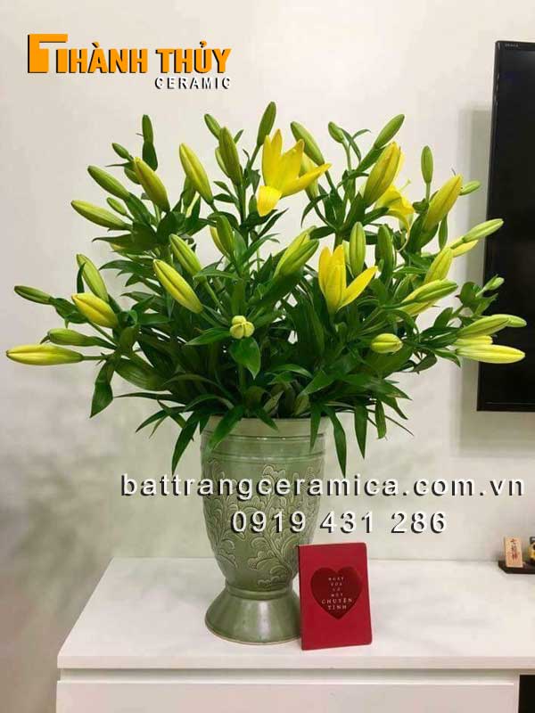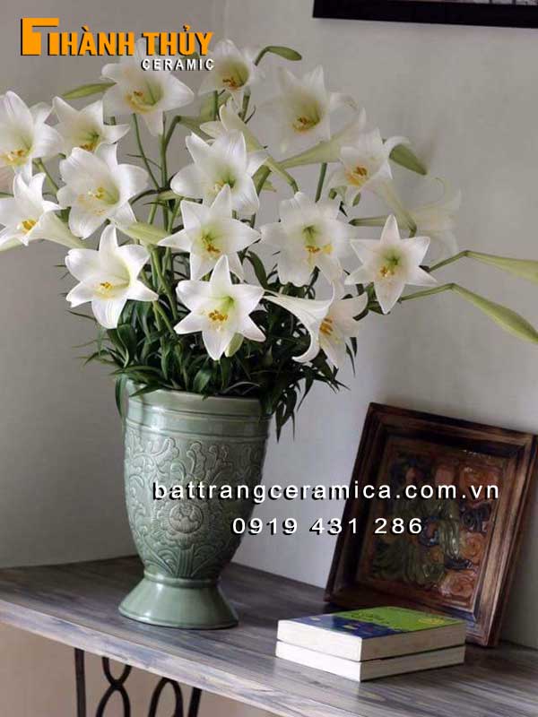 Ngoài ra, việc cắm hoa ly vào bình gốm sứ này cũng rất đơn giản. Bạn chỉ cần đổ nước vào bình, dùng xốp và khay nhựa lót phía dưới để tạo dáng cho hoa. Những bình cắm hoa như thế này không chỉ làm đẹp cho bàn ăn hay bàn thờ mà còn đem lại sự sang trọng, ấm cúng cho không gian sống của bạn.
