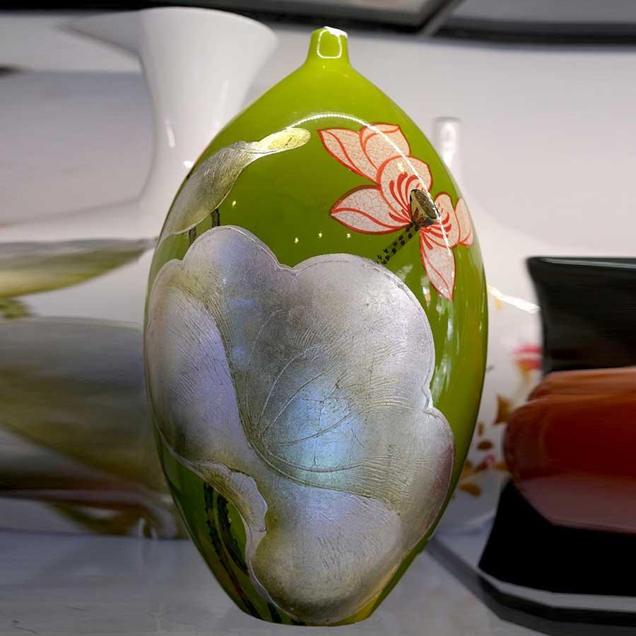 Chất men của bình rất đa dạng, từ màu sắc đến độ bóng, giúp sản phẩm tỏa sáng trong không gian sống. Bát Tràng vốn nổi tiếng với gốm sứ cao cấp, khi kết hợp với sơn mài, tạo ra những tác phẩm tài tình và độc nhất vô nhị. Một bộ ba bình gốm sơn mài với họa tiết hoa sen khảm bạc chẳng hạn, không chỉ là một điểm nhấn nghệ thuật mà còn thể hiện sự sang trọng cho không gian nội thất.