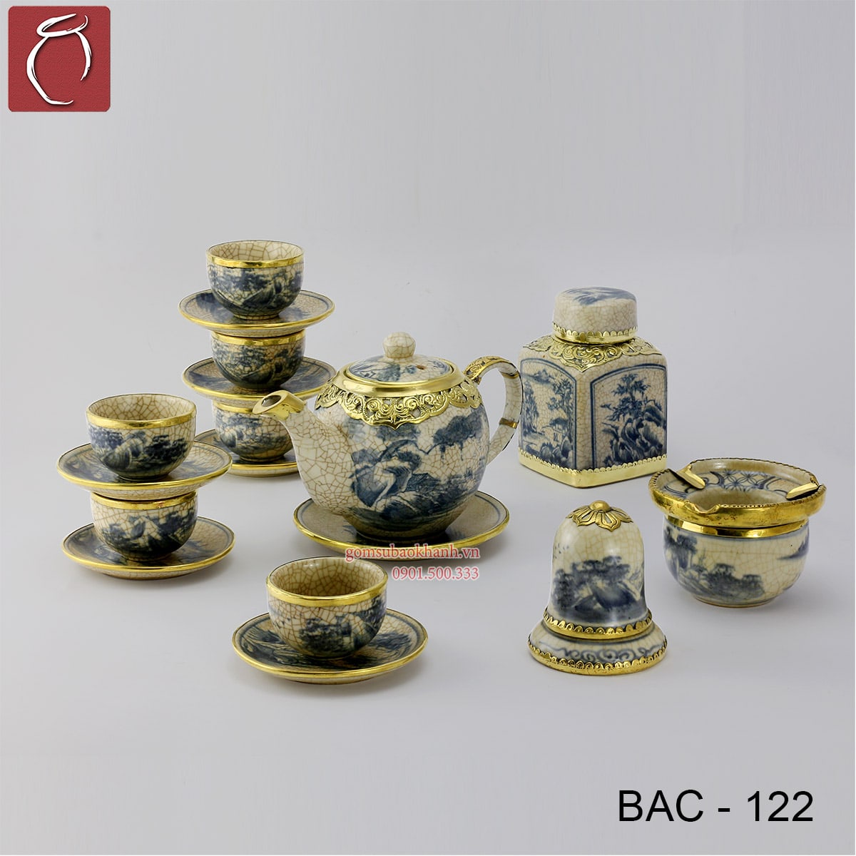 Ấm chén bọc đồng là một sản phẩm gốm sứ cao cấp, kết hợp giữa nghệ thuật truyền thống và sự tinh tế hiện đại. Với phần gốm được phủ một lớp đồng mỏng, sản phẩm mang lại vẻ đẹp sang trọng và độc đáo, thể hiện sự tỉ mỉ từ các nghệ nhân Bát Tràng.