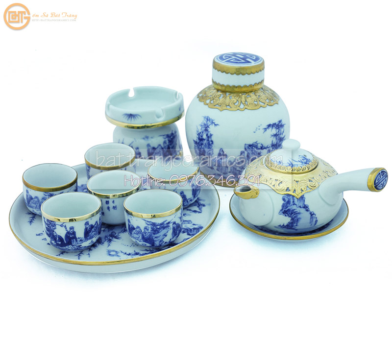 Ấm chén bọc đồng cao cấp Bát Tràng là một sản phẩm không chỉ mang vẻ đẹp sang trọng mà còn thể hiện nghệ thuật tinh tế trong chế tác gốm. Bộ sản phẩm bao gồm 1 ấm, 6 chén, 7 đĩa kê, 1 gạt tàn, 1 ống đổ nước thừa, và 1 ống tăm, tất cả đều được bọc một lớp đồng mỏng bên ngoài, tạo nên sự hài hòa giữa gốm sứ và kim loại.