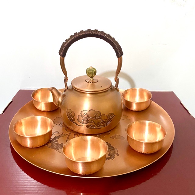 Các mẫu bộ ấm trà bằng đồng hiện đang được ưa chuộng không chỉ vì tính năng sử dụng mà còn ở vẻ đẹp tinh xảo và sang trọng của chúng. Một bộ ấm trà bằng đồng đỏ kỹ nổi bật với khay rộng 29cm, kèm theo năm chén nhỏ tinh tế. Ấm trà cao 17cm, tổng trọng lượng của bộ khoảng 1,5kg, rất thích hợp cho những người yêu thích việc thưởng trà trong không gian trang nhã.