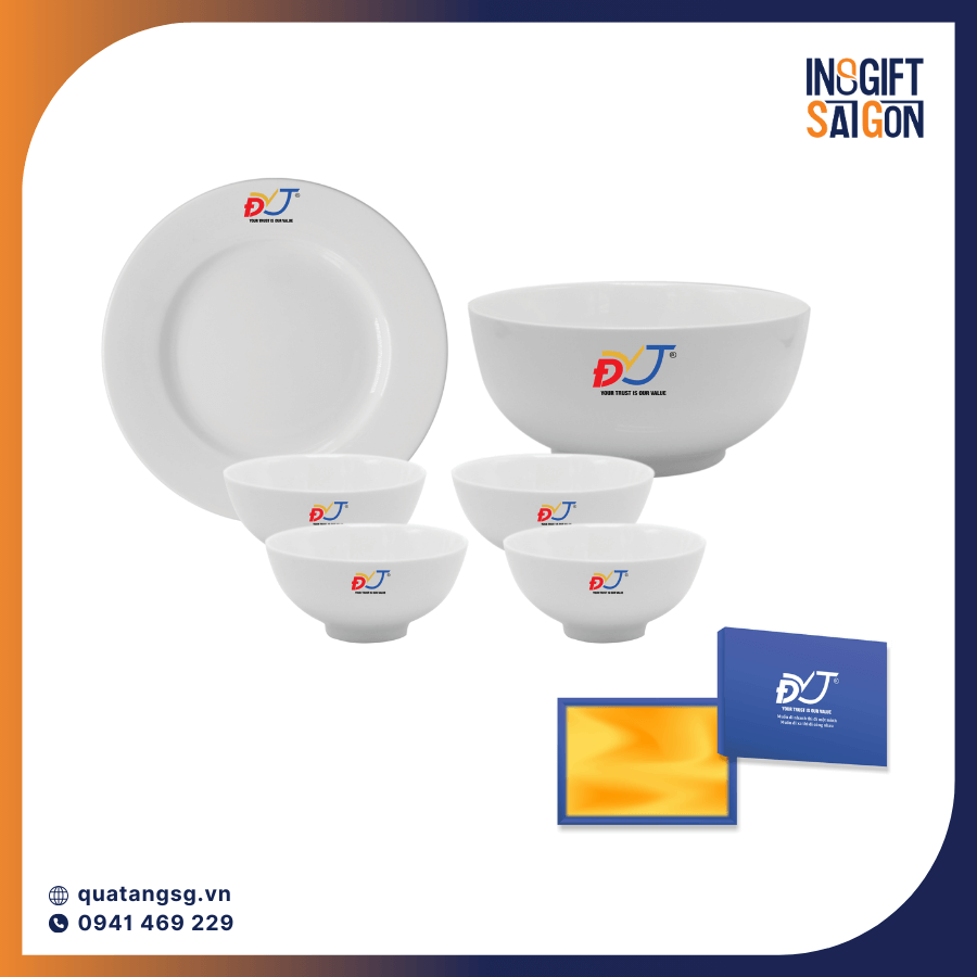 Bộ bàn ăn này thường bao gồm các vật dụng như đĩa, tô, chén, ly và muỗng, tất cả đều được thiết kế đồng bộ và có thể in logo theo yêu cầu. Đây trở thành một món quà tặng doanh nghiệp lý tưởng cho nhiều dịp khác nhau như lễ kỷ niệm, tri ân khách hàng hay các sự kiện cuối năm.