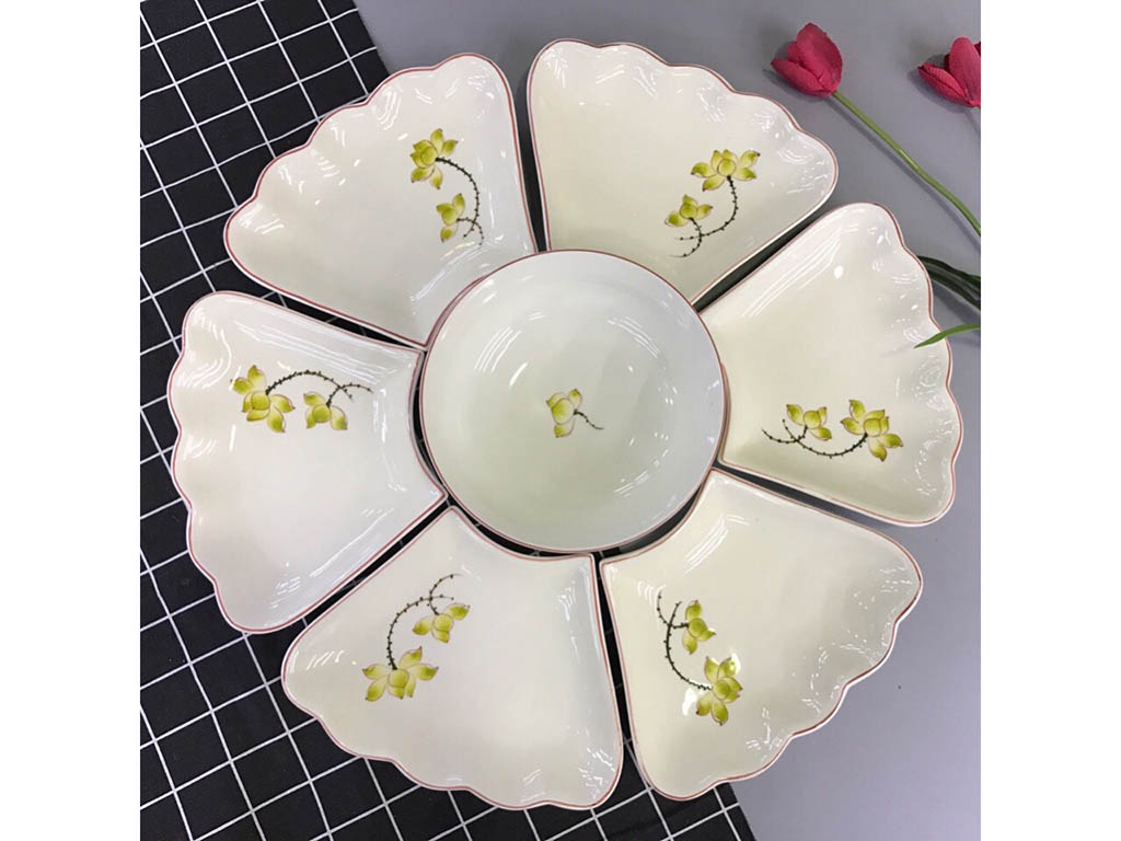 Bộ Bát Đĩa Hoa Mặt Trời là một sản phẩm độc đáo, mang nét đẹp tự nhiên như chính tên gọi của nó. Với thiết kế các cánh hoa được làm từ 6 chiếc đĩa xếp vòng tròn, nhị hoa là bát tô to và sâu, bộ sản phẩm này không chỉ có tác dụng trang trí mà còn rất tiện nghi khi sử dụng.
