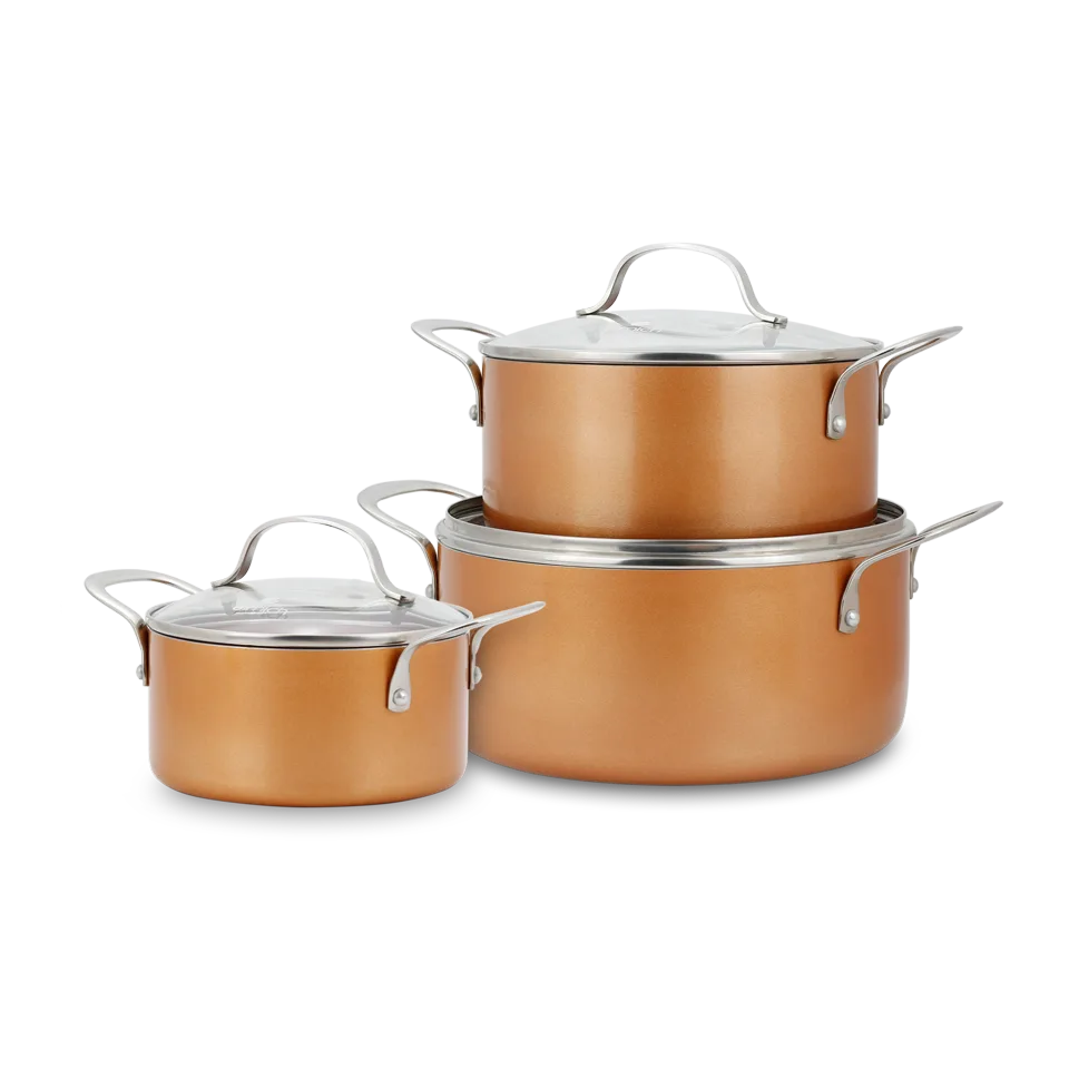 Quai nồi được làm từ thép không gỉ, thiết kế cách nhiệt an toàn, luôn giữ mát khi nấu. Với chất liệu gốm cao cấp, bộ nồi không chỉ bền bỉ mà còn hoàn toàn an toàn cho sức khỏe, bảo toàn vitamin và khoáng chất trong thực phẩm. Bạn có thể yên tâm nấu nướng mà không lo về vấn đề an toàn thực phẩm.