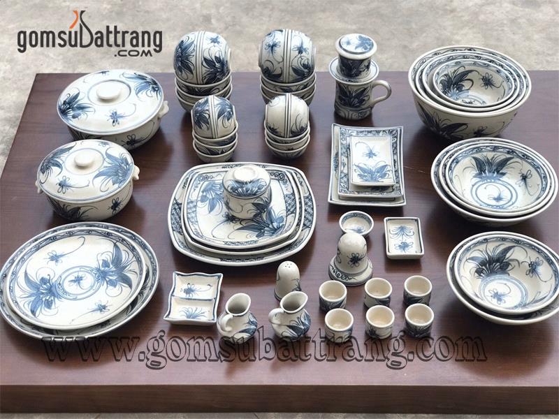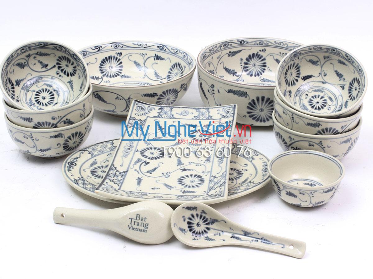 Bộ bát đĩa men lam gồm 13 món, bao gồm chén cơm, bát mắm, đĩa muối và nhiều sản phẩm khác, phục vụ đầy đủ cho các bữa tiệc. Đặc biệt, với kỹ thuật vẽ tay tinh xảo, mỗi sản phẩm đều là một tác phẩm nghệ thuật độc đáo, xứng đáng có một chỗ đứng trong không gian bếp của mọi gia đình.