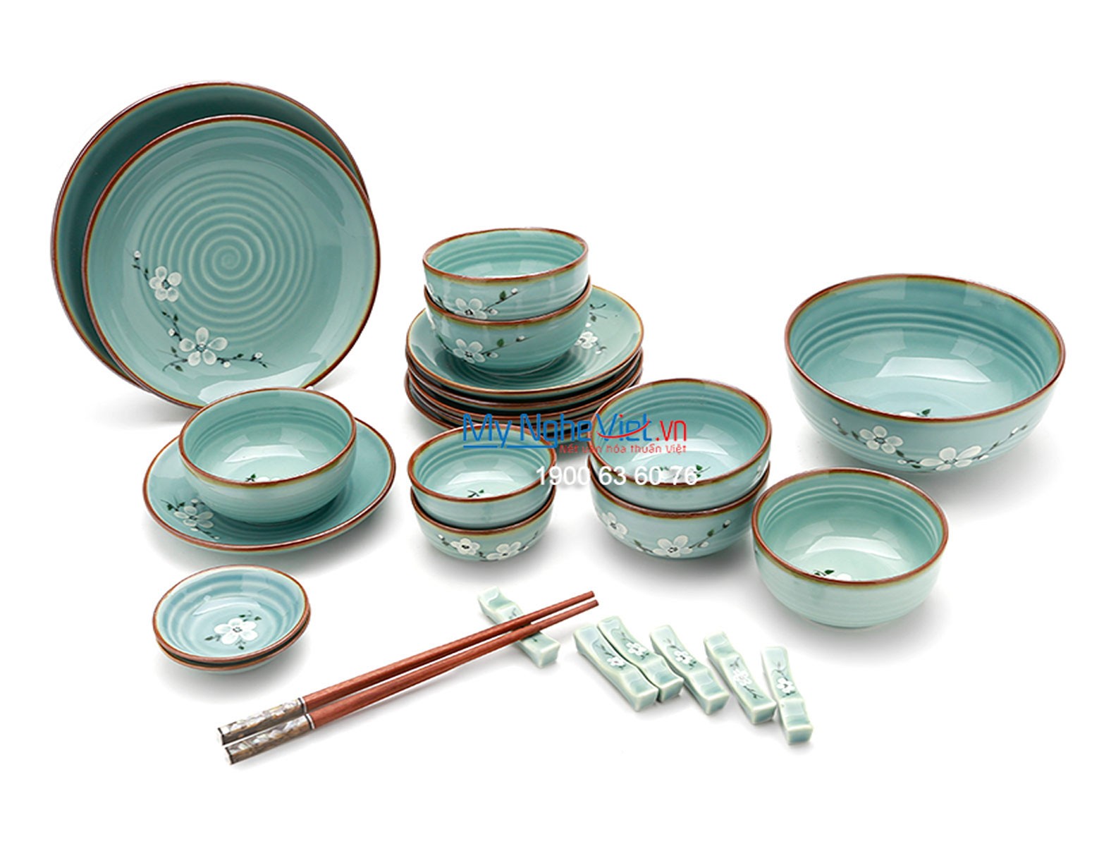 Ngoài ra, bộ bát đĩa men xanh 20 món cũng rất ấn tượng và có giá cả hợp lý, chỉ 2.000.000₫ (giảm xuống 1.550.000₫). Những họa tiết tinh tế như vẽ hoa hay men hỏa biến khiến cho bàn ăn của bạn trở nên sang trọng và đẹp mắt hơn.