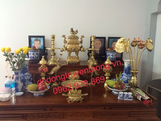 Tiếp đến, bộ đỉnh thờ gồm đỉnh hạc với đôi chân nến hoặc đèn dầu cũng rất cần thiết. Chúng không chỉ có giá trị thẩm mỹ mà còn giúp tạo nên không khí trang nghiêm trong các lễ nghi. Ngoài ra, lọ hoa, kỷ chén, mâm bồng đều là những vật phẩm hỗ trợ cho việc cúng bái thêm trọn vẹn.