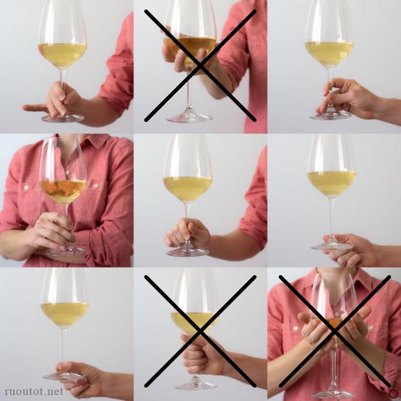 Để có được động tác cầm ly thanh lịch hơn, bạn có thể đặt ngón trỏ tựa vào phần bầu ly, còn ngón cái và ngón giữa thì đặt ở phần chân gần đế nhất. Tốt hơn hết, hãy hạn chế tối đa việc chạm tay vào phần kính, vì nhiệt độ từ bàn tay có thể làm rượu ấm lên và ảnh hưởng đến hương vị.