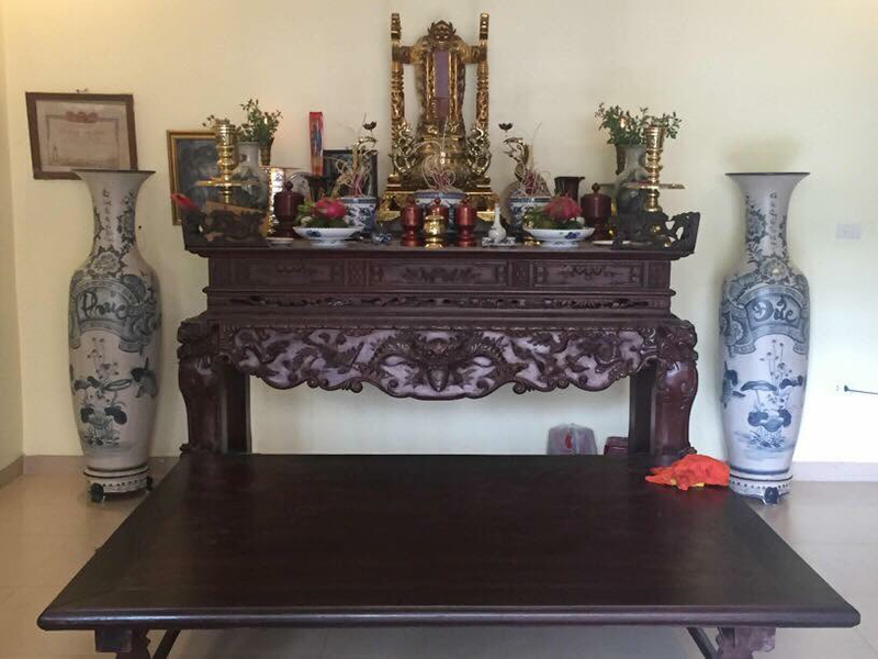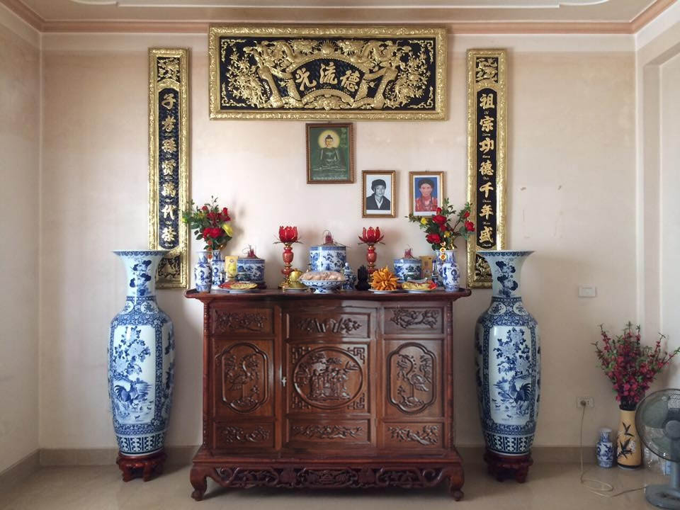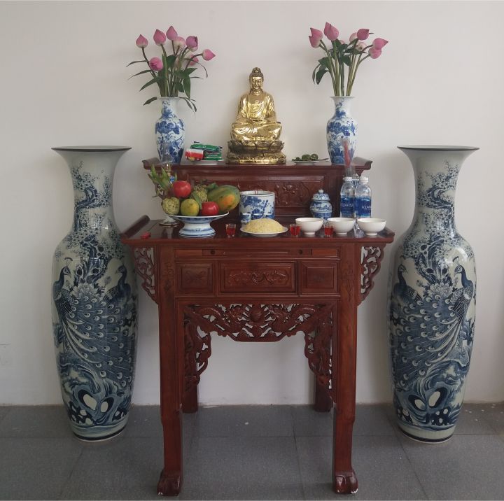 Tuy nhiên, nếu bạn quyết định sử dụng hai lộc bình, hãy nhớ nguyên tắc “Đông Bình Tây Quả”. Hai bình này nên được đặt đối xứng ở hai bên bát hương, đảm bảo không che khuất tôn nghiêm của bát hương và các vật phẩm thờ khác. Khi bố trí, cần chú ý đến khoảng cách giữa lộc bình và mép ngoài bàn thờ để không che khuất họa tiết bàn thờ.