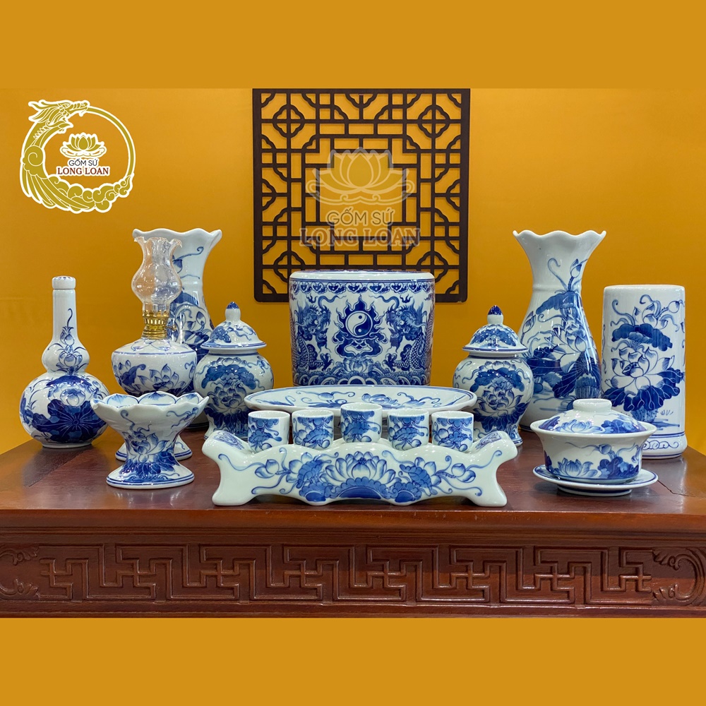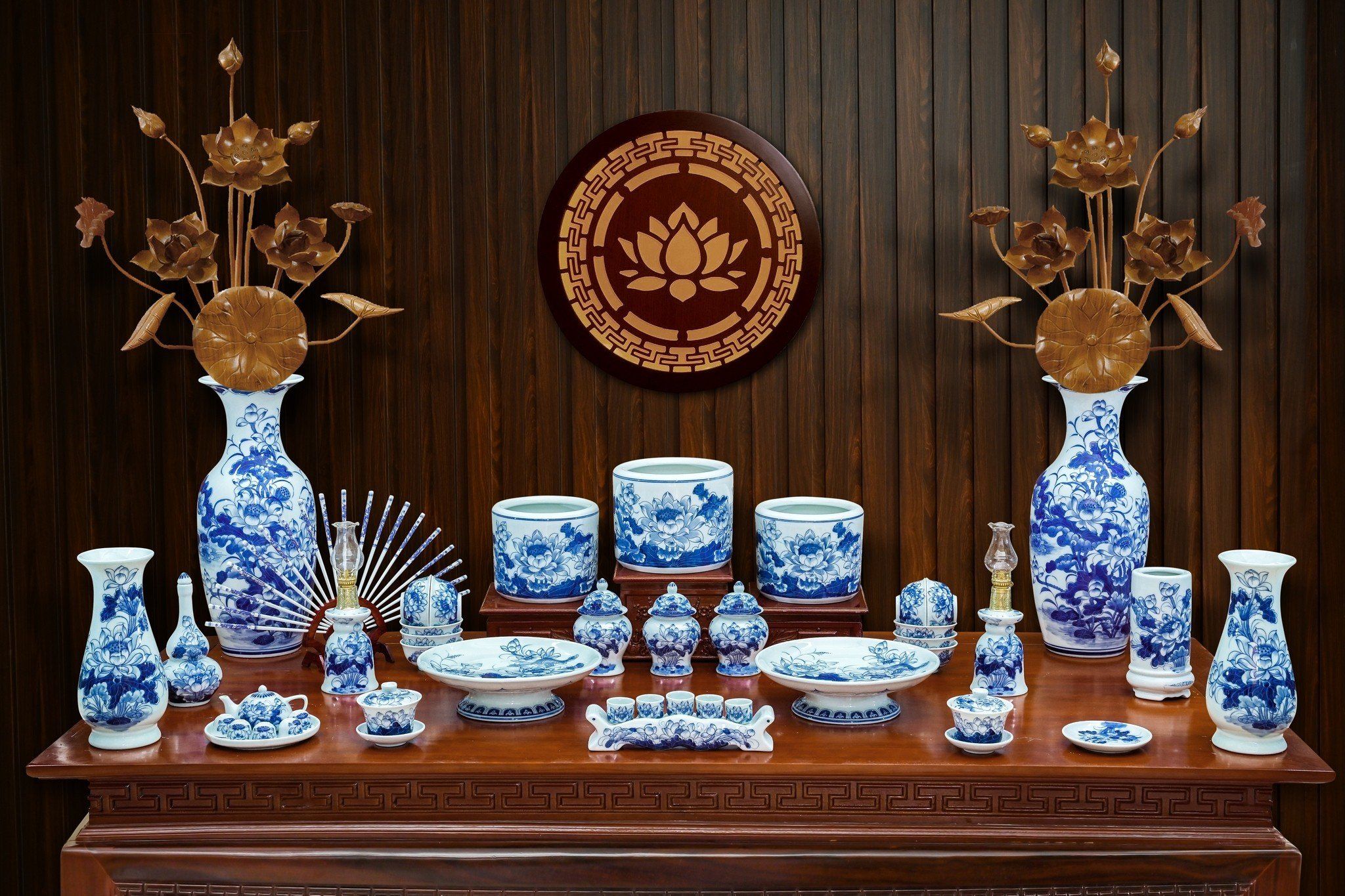 Chất liệu gốm sứ men lam với sắc xanh nổi bật không chỉ tạo sự hài hòa mà còn mang lại vẻ đẹp cổ điển cho không gian. Những sản phẩm như bộ bát đũa thờ hay ấm chén trà thường được lựa chọn để trang trí bàn thờ, thể hiện lòng hiếu thảo và sự kính trọng với tổ tiên. Đặc biệt, bộ đồ thờ Bát Tràng được chế tác thủ công tinh xảo, mang nét đặc trưng của làng nghề truyền thống, tạo nên giá trị nghệ thuật cao.