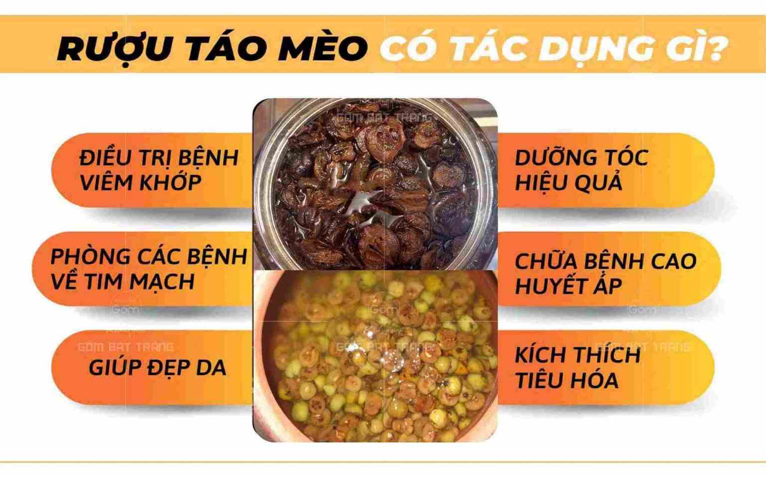Rượu táo mèo là một trong những bài thuốc dân gian nổi tiếng, đặc biệt trong việc giảm đau xương khớp. Với khả năng chữa trị các bệnh lý như đau nhức xương khớp, đau lưng và mỏi gối do thoái hóa, rượu này mang lại cảm giác dễ chịu cho người sử dụng, đặc biệt khi thời tiết thay đổi. Người dân thường ngâm rượu với tỉ lệ 1kg táo mèo và 2kg đường, sau một tuần ngâm, các dưỡng chất sẽ giải phóng và tạo nên loại rượu có hương vị thơm ngon, bổ dưỡng.