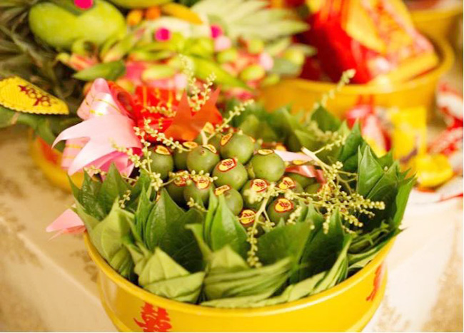 Ngày lễ ăn hỏi, trầu cau càng trở nên trang trọng hơn, với 100 quả cau kèm 100 lá trầu được sắp xếp đẹp mắt. Mâm trầu không chỉ đơn thuần là sự chuẩn bị cho buổi lễ mà còn mang theo những ước vọng, hy vọng về một cuộc sống hôn nhân đầy yêu thương và hạnh phúc. Mỗi chi tiết nhỏ trong mâm trầu là một lời chúc phúc, một hứa hẹn cho tương lai tươi sáng.