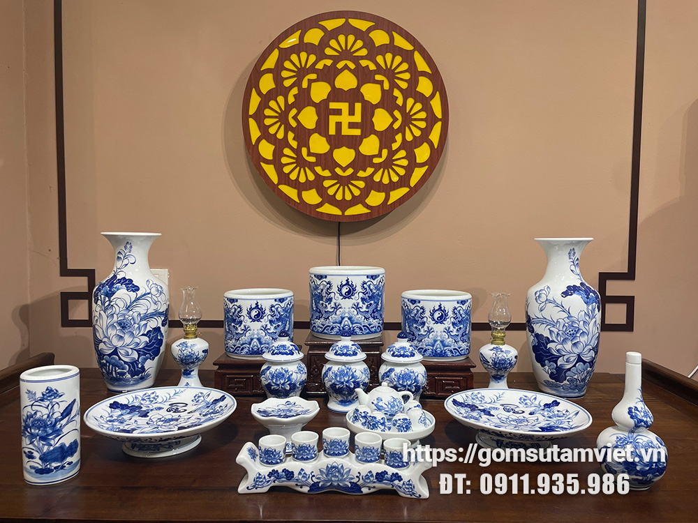 Mỗi bộ đồ thờ Bát Tràng thường có đầy đủ các vật phẩm thờ cúng như bát hương, mâm bồng, lọ hoa, đèn dầu, chân nến, và các dụng cụ khác. Điểm nhấn của bộ đồ thờ gốm sứ Bát Tràng men lam chính là vẻ đẹp tinh tế với gam màu xanh lam cổ điển, tạo nên sự hài hòa cho không gian thờ cúng.