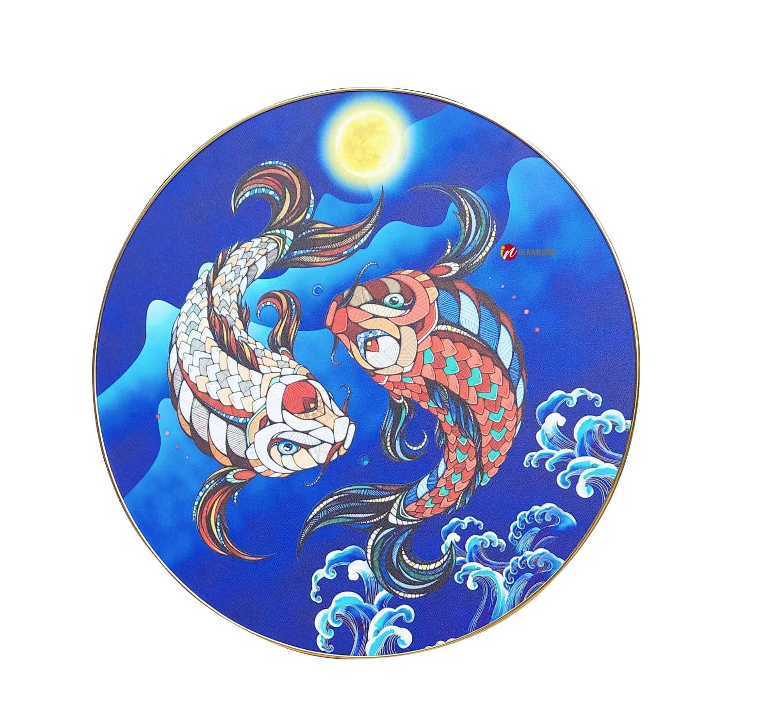 Cá chép, với ý nghĩa vượt vũ môn, tượng trưng cho sự kiên trì và khát vọng thành công. Trong phong thủy, những bức tranh này thường được treo để gia tăng tài vận cho không gian sống. Với màu sắc tươi sáng, hình ảnh cá chép vàng trên nền đen làm nổi bật ánh trăng, tạo nên một bức tranh sống động và ấn tượng.
