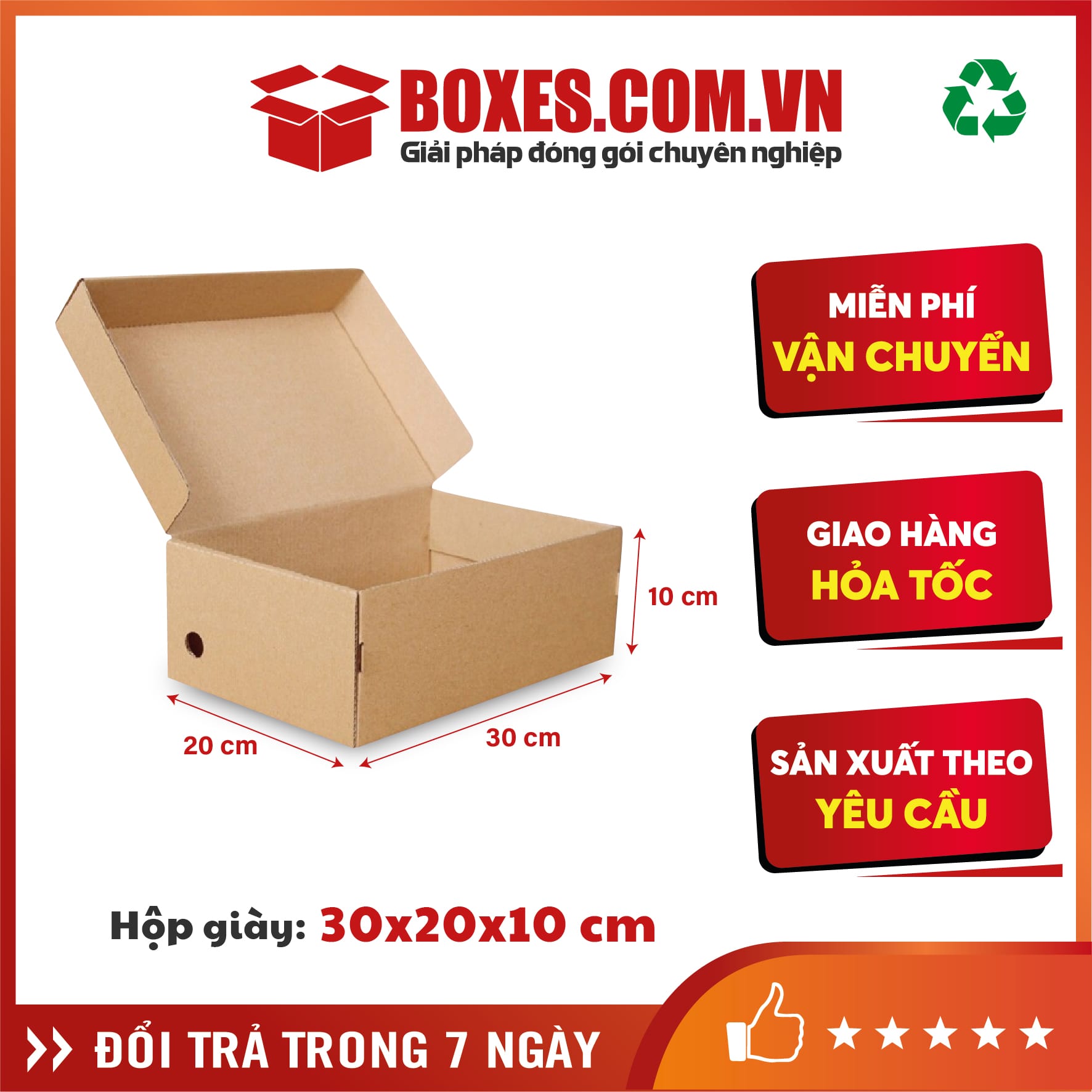 Hộp đựng giày bằng giấy carton ngày càng được ưa chuộng nhờ vào thiết kế tiện lợi và tính thân thiện với môi trường. Hình dạng chữ nhật với nắp gập bao trọn hộp không chỉ giúp bảo vệ giày tốt hơn mà còn dễ dàng lưu trữ. Kích thước phổ biến 18cm x 29cm x 9.5cm là lựa chọn hợp lý cho nhiều loại giày khác nhau, từ giày thể thao đến giày công sở.