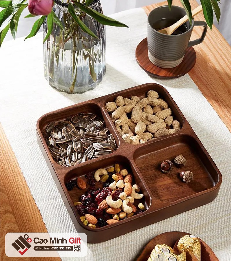 Thay vì sử dụng những mẫu khay nhựa thông thường, hãy thử thay đổi phong cách với khay gỗ để tạo điểm nhấn tinh tế cho bữa tiệc ngày Tết của bạn. Hãy để hộp đựng mứt Tết bằng gỗ trở thành một phần không thể thiếu trong không gian sum vầy của gia đình bạn.