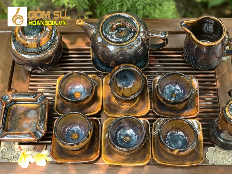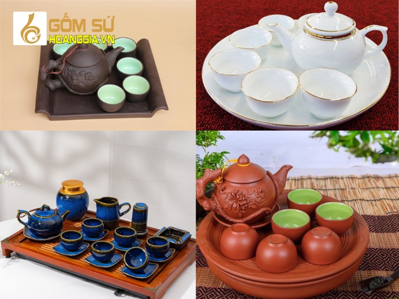 Bên cạnh khay gỗ, bộ ấm chén gốm sứ Hải Long Bát Tràng là một lựa chọn hoàn hảo cho những ai yêu thích sự tinh tế. Với chất liệu sứ tráng men cao cấp, bộ sản phẩm không chỉ bền mà còn mang lại sự sang trọng và ấm cúng cho buổi thưởng trà. Đặc biệt, các họa tiết như sen hay vẽ vàng làm tăng thêm giá trị nghệ thuật.