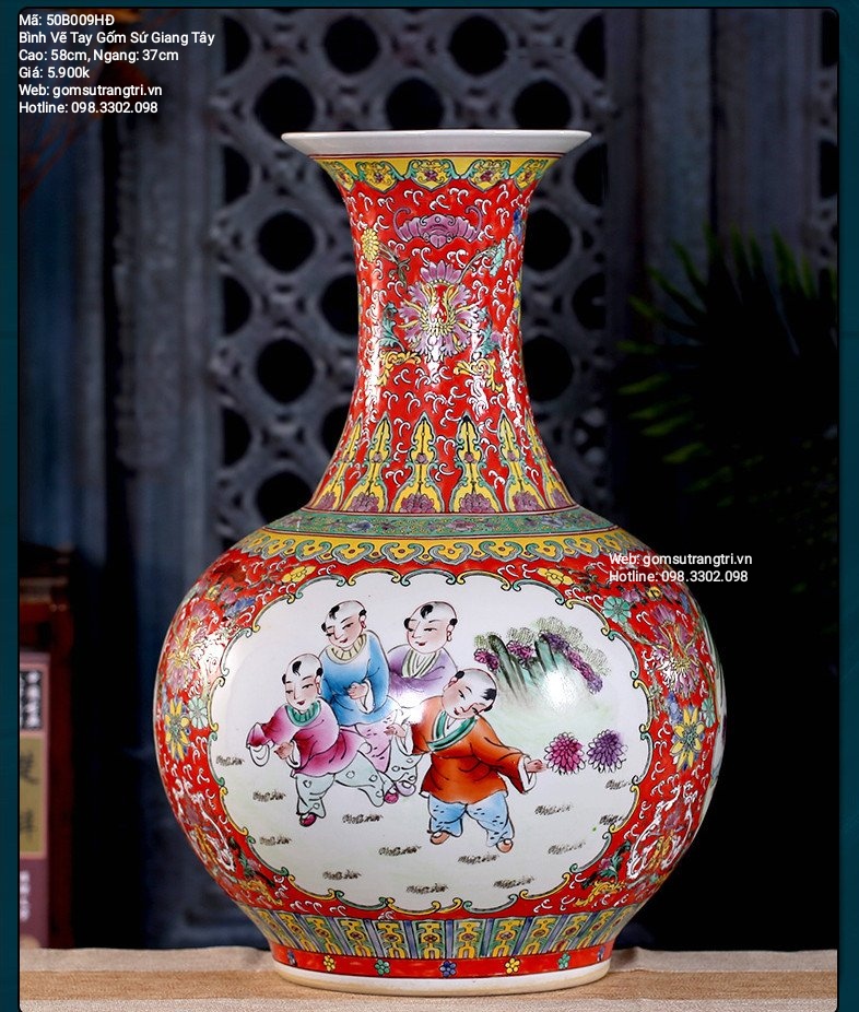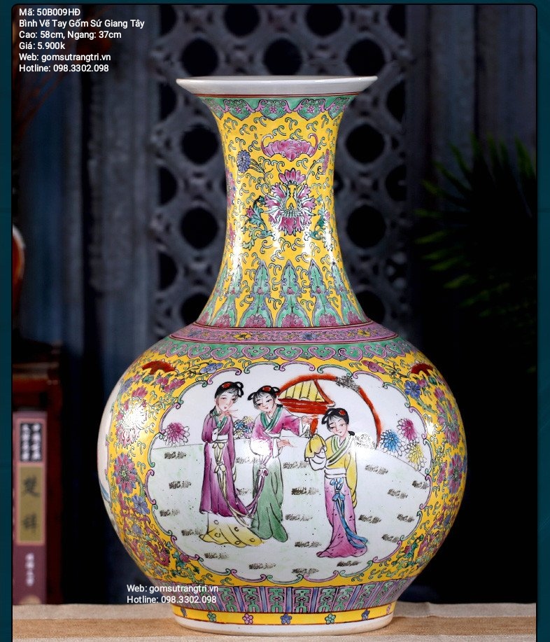 Bình hoa gốm sứ Trung Quốc hiện đang trở thành một món đồ trang trí rất được yêu thích trong không gian sống hiện đại. Với chiều cao 58 cm và đường kính 37 cm, sản phẩm này có giá khoảng 5.900.000 đồng, trong đó có chương trình giảm giá lên đến 58%. Bạn có thể tìm thấy những chiếc bình này tại cửa hàng 57 Nguyễn Văn Huyên, Cầu Giấy, Hà Nội, hay thông qua hotline 098.3302.098.