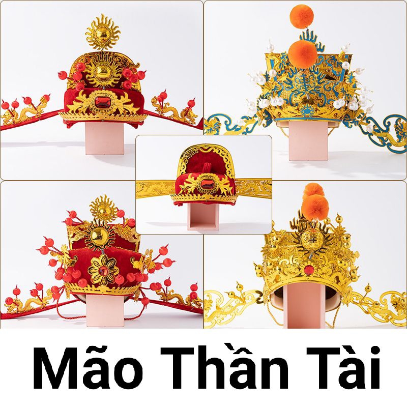 Ngoài ra, combo mũ và áo mão dành cho Thần Tài cũng rất phong phú. Chúng được may từ chất liệu vải tốt, bền đẹp và có nhiều kích cỡ, phục vụ nhu cầu đa dạng của khách hàng. Giá cho một bộ này khoảng 275,000₫, rất hợp lý cho những ai yêu thích phong cách truyền thống.