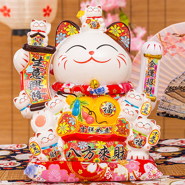Đặc biệt, động tác vẫy tay trái của mèo không chỉ là một cử chỉ dễ thương mà còn có ý nghĩa chiêu tài, cầu mong tiền bạc. Ngoài ra, câu đối “金運招財” (Kim vận chiêu tài) trên tay trái càng làm nổi bật thêm sứ mệnh của chú mèo trong việc mang đến nguồn năng lượng tích cực.