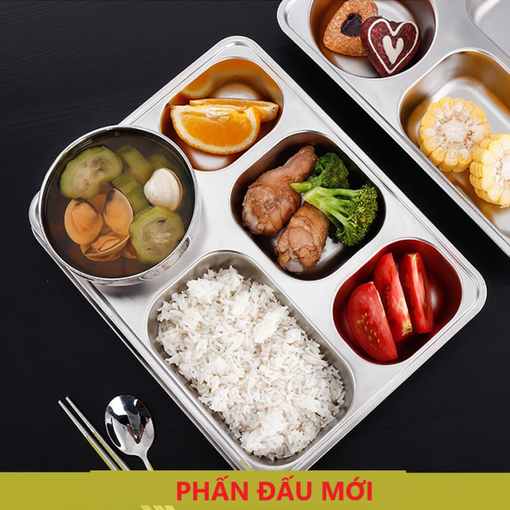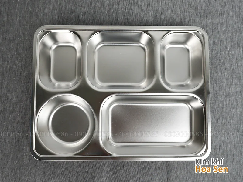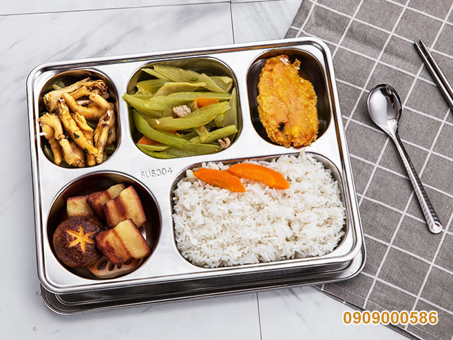 Ngoài khay nhựa, khay inox cũng là lựa chọn hàng đầu với nhiều mẫu mã như khay 5 ngăn sâu Hàn Quốc hay Đài Loan. Chúng có giá từ 75.000₫ đến 150.000₫, được làm từ inox 304 bền chắc và dễ vệ sinh. Thiết kế sâu lòng và nhiều ngăn giúp bạn có thể phối hợp nhiều món ăn mà không lo lẫn lộn.