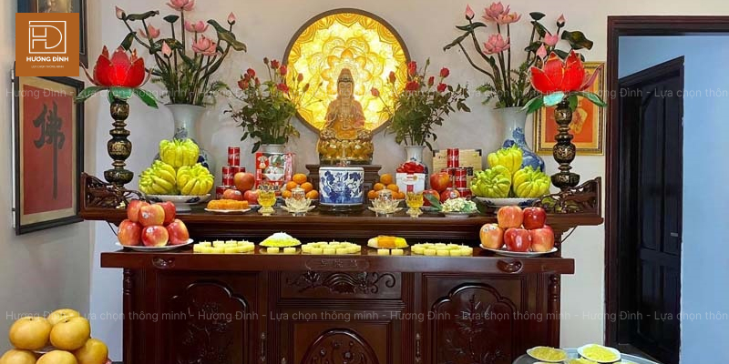 Ngoài việc sử dụng các phụ kiện thờ cúng cơ bản như bát hương và lư xông trầm, bạn cũng có thể thêm những vật phẩm decor như tượng Phật hay bình hút lộc. Các vật dụng này không chỉ đẹp mắt mà còn giúp tạo ra bầu không khí thanh tịnh và ấm cúng. Kệ ly rượu và bộ ấm trà đẹp mắt cũng là lựa chọn không tồi để trang trí, tạo không gian trò chuyện và giao lưu trong gia đình.