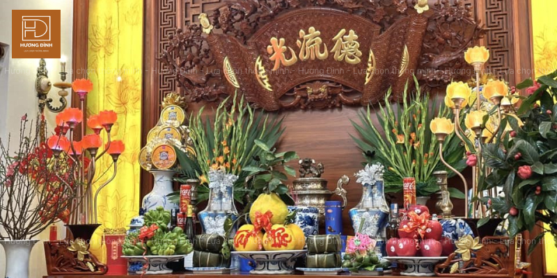 Đồ trang trí bàn thờ không chỉ giúp không gian thờ cúng trở nên đẹp mắt mà còn thể hiện tấm lòng thành kính của gia chủ đối với tổ tiên. Vị trí các vật phẩm trên bàn thờ rất quan trọng. Những vật phẩm như mâm bồng, chóe, kỷ chén thường được bài trí đối xứng hai bên để tạo sự cân đối và hài hòa. Điều này không chỉ mang tính thẩm mỹ mà còn thể hiện sự tôn trọng trong thờ cúng.