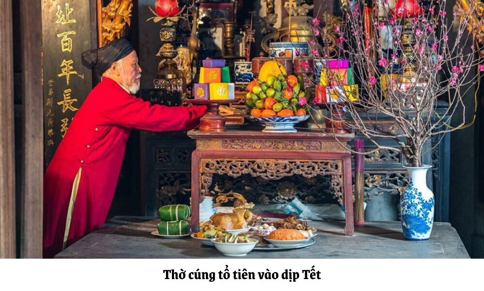 Vào những ngày Tết, việc thờ cúng tổ tiên trở thành một nét văn hóa đặc biệt quan trọng trong mỗi gia đình Việt Nam. Trước bàn thờ, mọi người thường mặc những bộ quần áo mới, tươm tất, nghiêm trang để thể hiện lòng kính trọng đối với ông bà tổ tiên. Thời gian cúng thường diễn ra vào ngày 30 Tết, hoặc 29 nếu năm đó thiếu tháng.