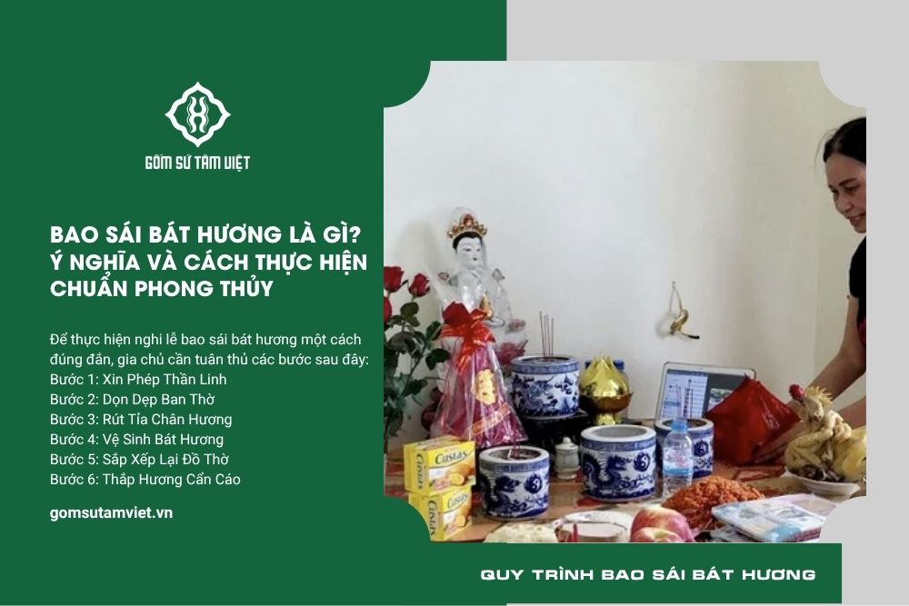 Trong tín ngưỡng thờ cúng của người Việt, bát hương là vật linh thiêng không thể thiếu trên bàn thờ gia đình. Việc bao sái bát hương là một nghi thức quan trọng giúp thanh tẩy, làm sạch và tôn kính thần linh, gia tiên, đồng thời thu hút nhiều may mắn, bình an cho gia chủ. Bài viết dưới đây sẽ giúp bạn hiểu rõ về thủ tục bao sái bát hương, ý nghĩa của phong tục này, cách thực hiện, chuẩn bị lễ vật, văn khấn cùng những lưu ý cần thiết, giúp bạn tiến hành lễ bao sái bát hương đúng cách và trang nghiêm nhất.
