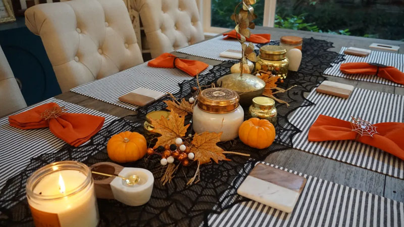 Halloween là thời điểm tuyệt vời để bạn thỏa sức sáng tạo trong việc trang trí bàn tiệc. Để tạo không khí ma mị, một chiếc khăn trải bàn màu đen huyền bí sẽ là điểm khởi đầu hoàn hảo. Bạn có thể thêm những chiếc đĩa có họa tiết bí ngô hoặc đầu lâu để làm nổi bật chủ đề. Một yếu tố không thể thiếu là những cây nến, hãy chọn nến màu trắng hoặc đen và bày trí chúng xung quanh bàn để tạo ánh sáng mờ ảo.