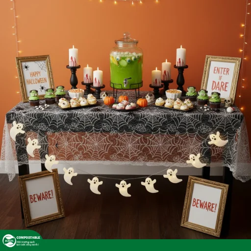 Halloween là dịp tuyệt vời để bạn thỏa sức sáng tạo với những bữa tiệc độc đáo. Đầu tiên, hãy chọn một chiếc khăn trải bàn màu đen huyền bí, đây chính là nền tảng hoàn hảo cho mọi trang trí. Tiếp theo, sử dụng bộ dụng cụ ăn uống với thiết kế in hình sọ người hoặc nhện để tăng thêm phần thú vị cho bàn tiệc.