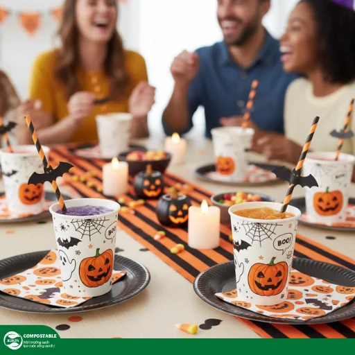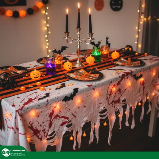 Halloween luôn là dịp để chúng ta thể hiện sự sáng tạo trong việc trang trí, và bàn tiệc không phải là ngoại lệ. Một chiếc khăn trải bàn màu đen huyền bí có thể ngay lập tức tạo ra không khí ma mị. Bên cạnh đó, sử dụng các bộ dụng cụ ăn uống màu sắc đặc trưng như tím, cam cùng với những chiếc ly có họa tiết ma quái sẽ giúp bàn tiệc trở nên hấp dẫn hơn.