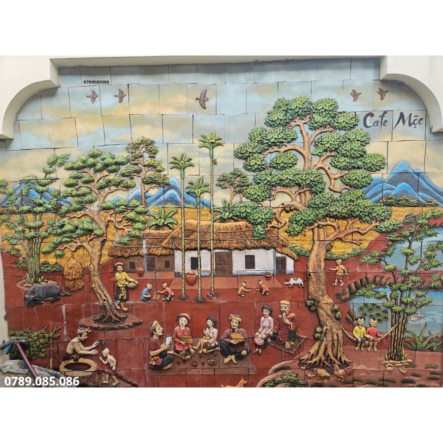 Tranh gốm đắp nổi là một trong những nét đặc trưng của nghệ thuật gốm sứ Bát Tràng, với những tác phẩm mang tính trang trí cao và được tạo ra bởi bàn tay khéo léo của các nghệ nhân. Những bức tranh này thường được đắp nổi hoặc khoét lõm, tạo nên chiều sâu và sự sống động cho họa tiết. Đặc biệt, các đề tài truyền thống như rồng, cây đa, hay cảnh làng quê Việt Nam thường xuyên xuất hiện, gợi nhớ về quê hương và văn hóa dân tộc.