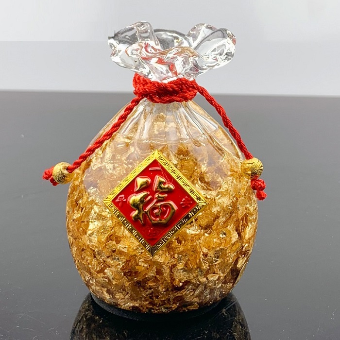 Chất liệu của túi tiền vàng phong thủy thường là thủy tinh, bên trong có chứa vàng lá 24K nguyên chất. Chiếc túi không chỉ dừng lại ở việc trang trí mà còn mang ý nghĩa sâu sắc về may mắn và tài lộc. Theo quan niệm phong thủy, việc sở hữu một chiếc túi vàng này sẽ gia tăng cát khí, giúp cho tài lộc vào như nước.