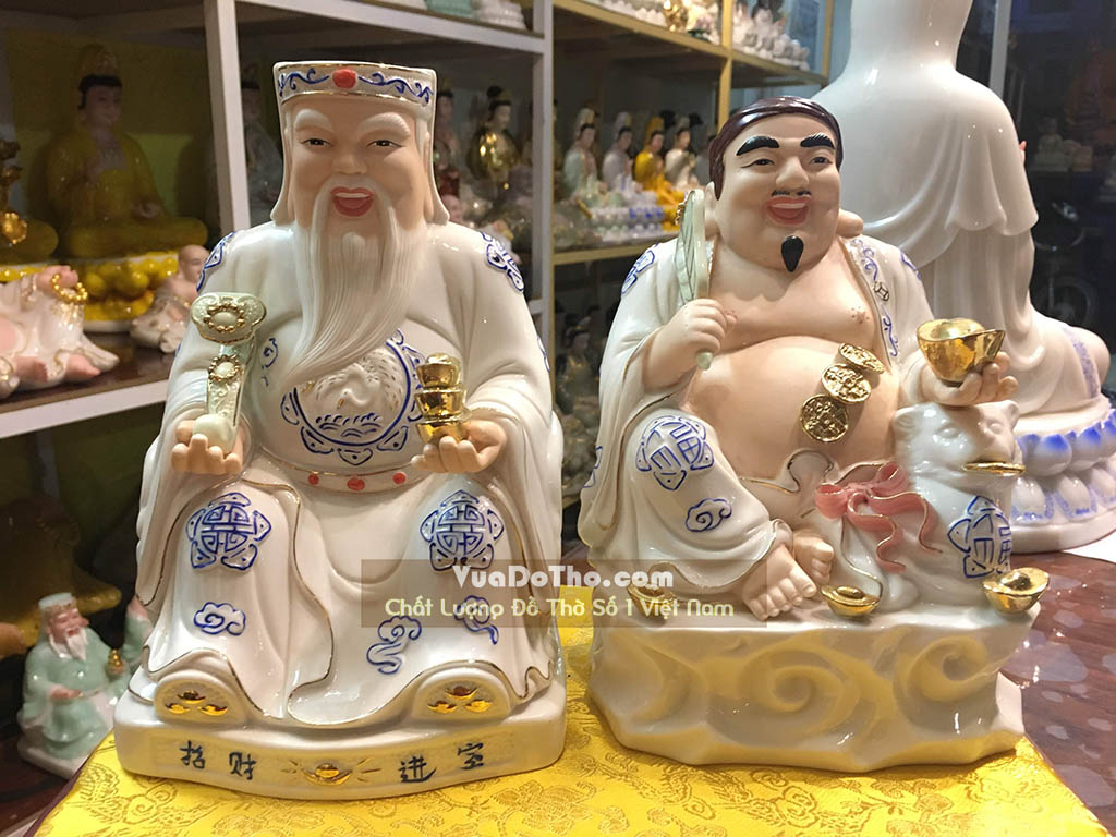 Điểm nổi bật của tượng Ông Thần Tài là hình ảnh ông cầm cây gậy như ý biểu trưng cho quyền lực và may mắn, tay còn lại nâng thỏi vàng mang ý nghĩa của sự thịnh vượng và giàu có. Những bộ tượng như Thần Tài và Thổ Địa bằng sứ không chỉ dành cho việc bài trí trên ban thờ mà còn là biểu tượng cho các giá trị tâm linh trong đời sống hàng ngày.