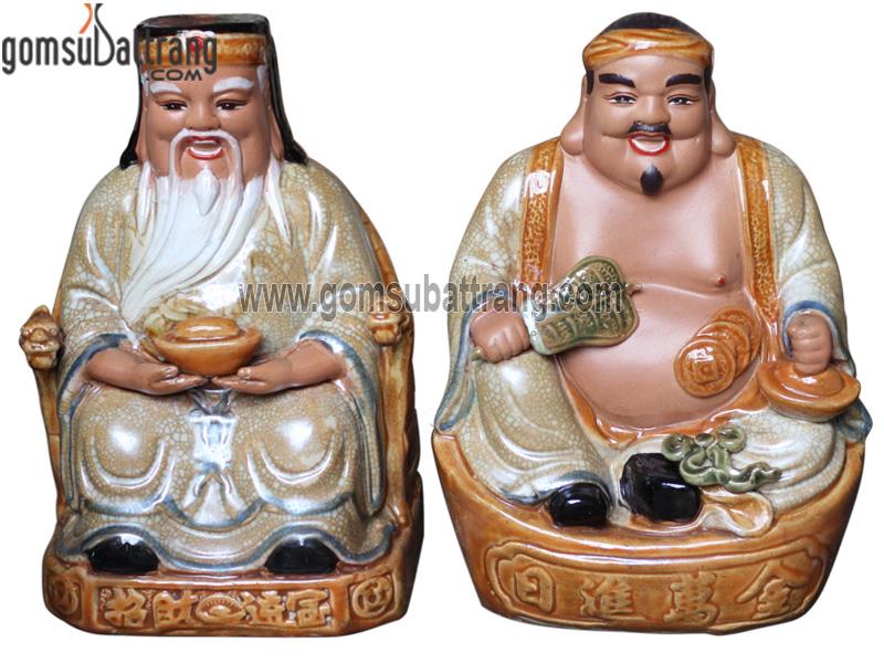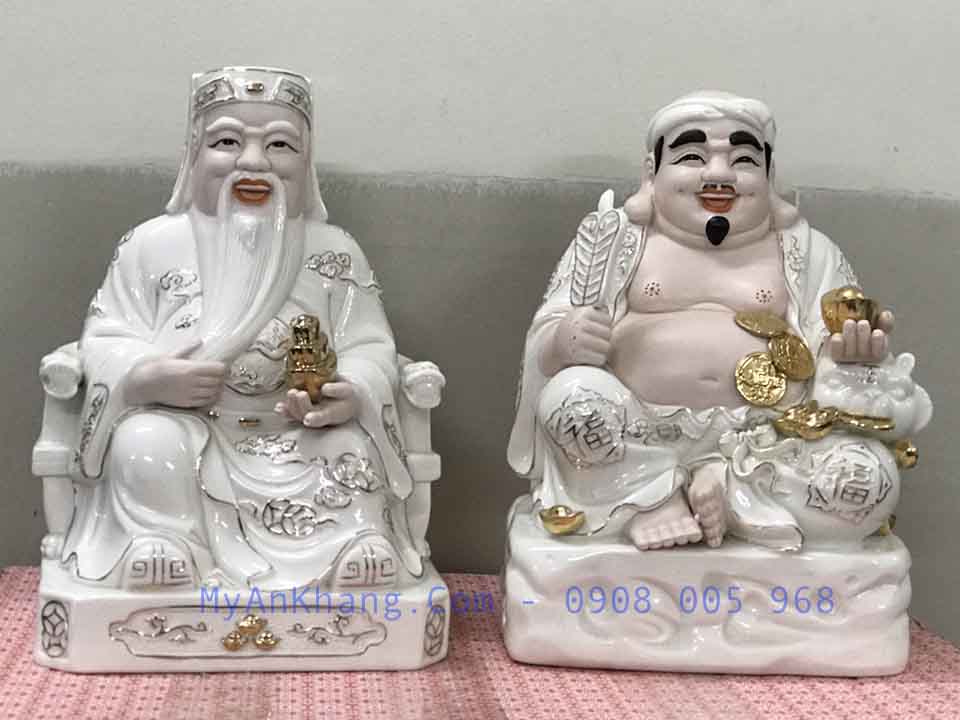 Chất liệu gốm sứ tráng men cùng với những đường nét vẽ tay viền vàng làm tăng thêm sự cao cấp cho bộ tượng. Kích thước đa dạng từ 18cm cho đến 30cm, phù hợp với nhiều không gian thờ cúng khác nhau. Tượng không chỉ có giá trị tâm linh mà còn là một tác phẩm nghệ thuật trang trí nổi bật.
